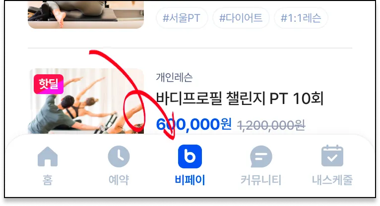 앱 아래 비페이를 눌러주세요! 내가 다니는 센터가 미리 만든 비페이 이용권을 확인할 수 있어요!