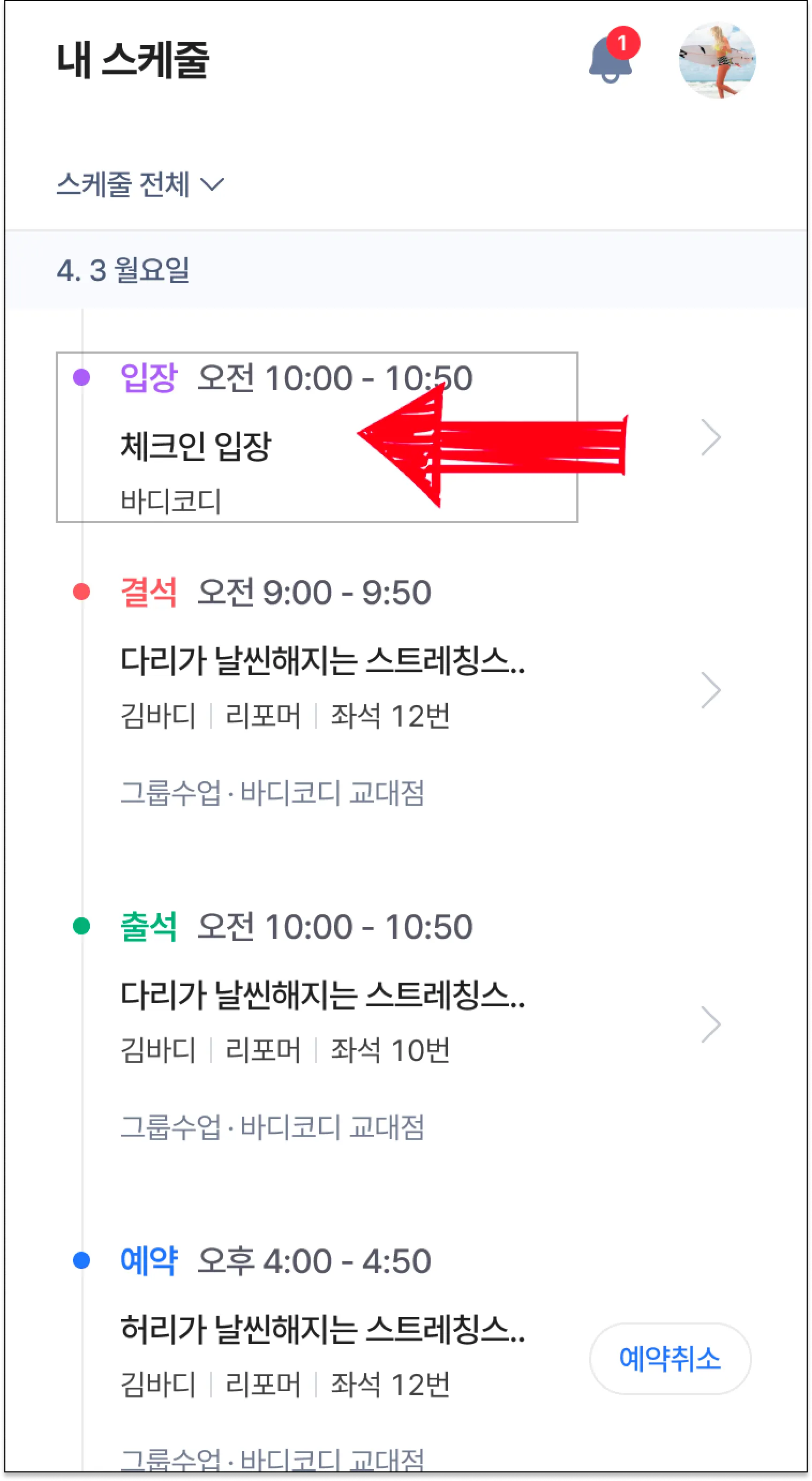 회원앱의 내 스케줄에 ‘입장’ 항목이 추가됐어요!