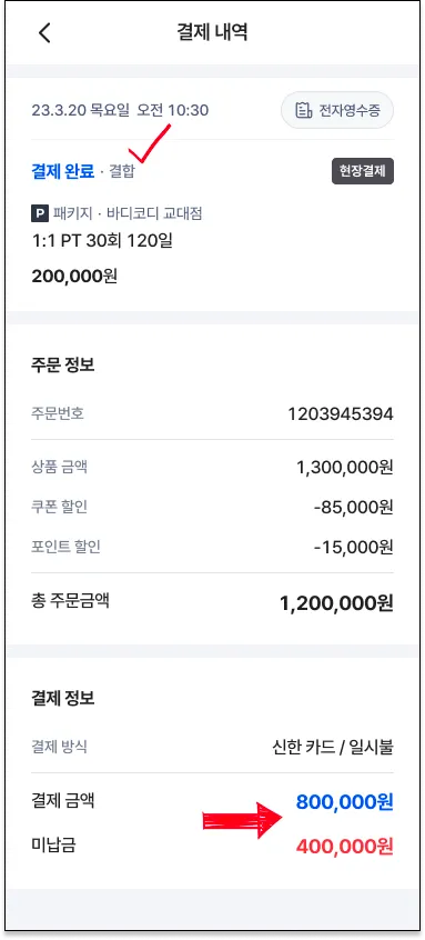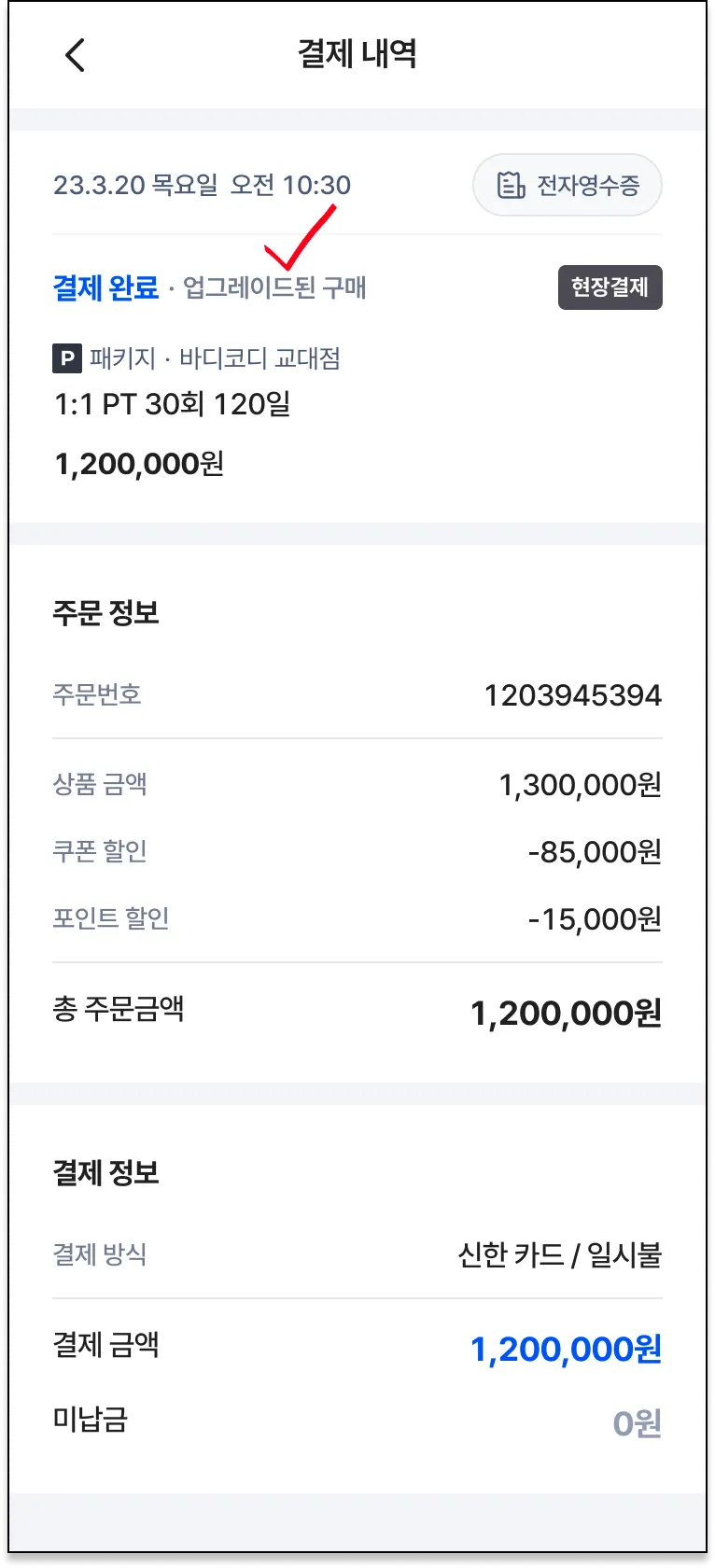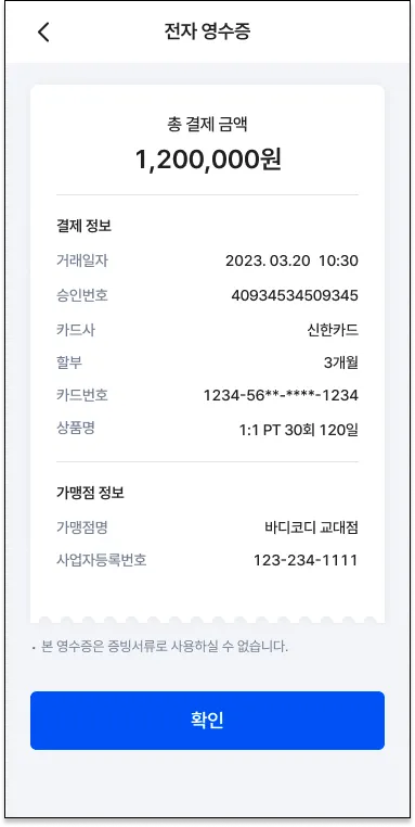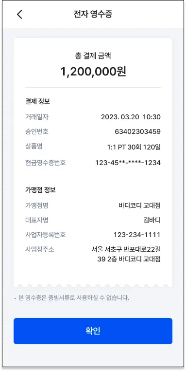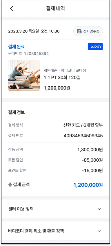 바디코디 회원앱은 비페이로 결제할 경우에만 결제 내역을 확인할 수 있고,