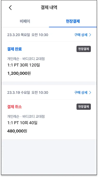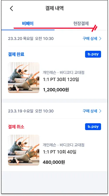현장결제내역이 추가되었어요! 이제 마이 바디코디 > 구매내역에서 비페이 결제 내역과 현장결제 내역을 확인할 수 있어요.