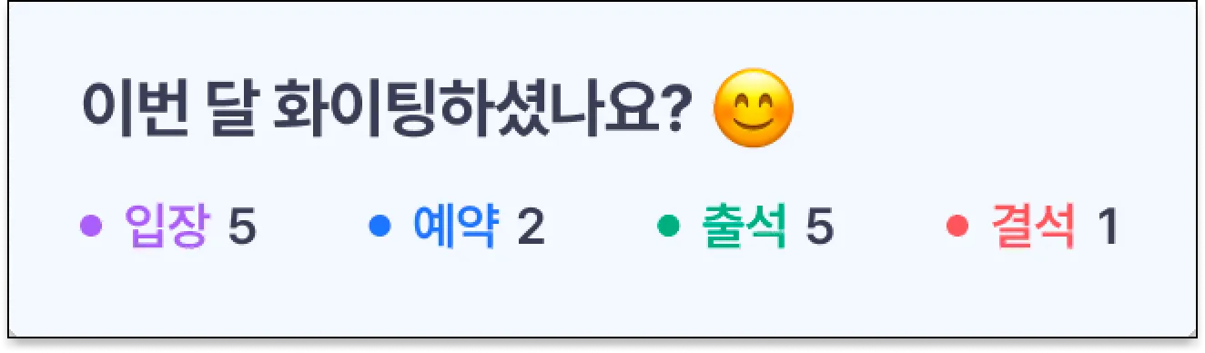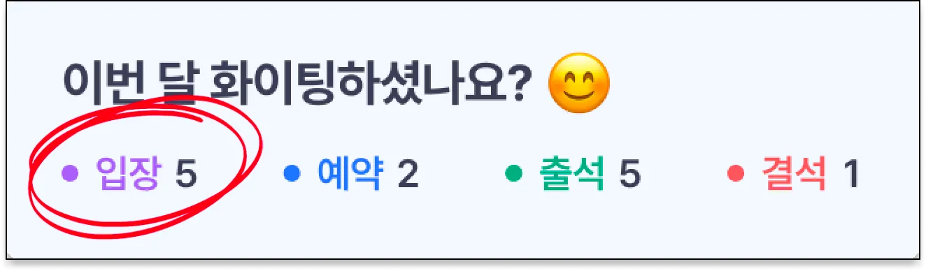 스케줄 요약에 ‘입장’이 추가됐어요! 이제 체크인으로 입장한 횟수를 한 눈에 확인할 수 있어요!