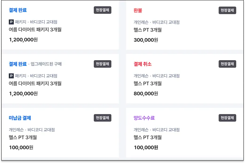 현장 결제는 분할 납부나, 환불, 양도수수료 등 다양한 결제 상황이 있어요.