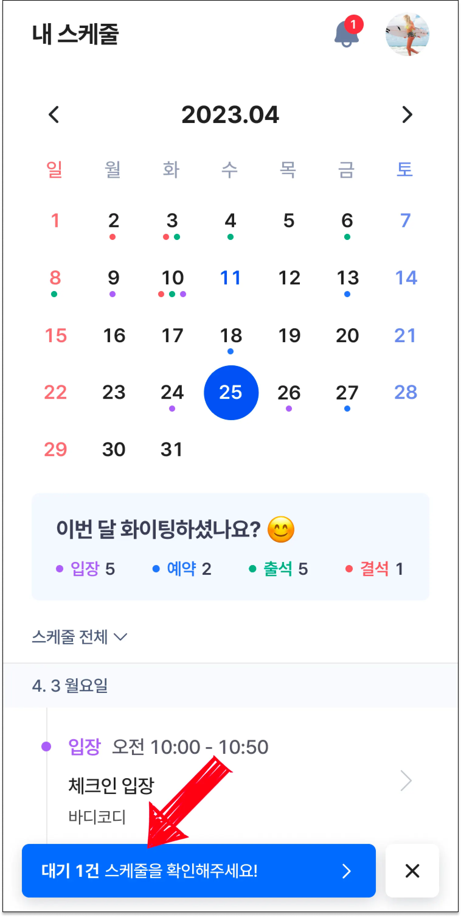 체크인 입장은 스케줄 요약과, 스케줄 목록에서 입장을 확인할 수 있어요!