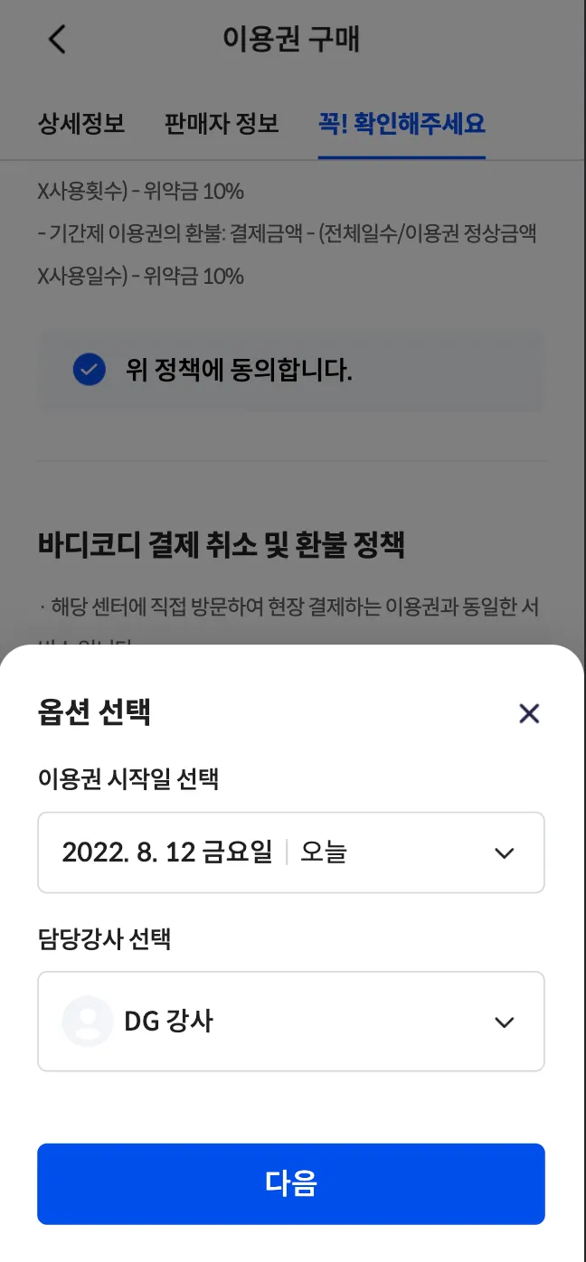 레슨 별 등록된 강사가 1명일 경우, 강사 선택이 없이 바로 다음 단계로 이용권을 구매할 수 있도록 개선하였습니다.
