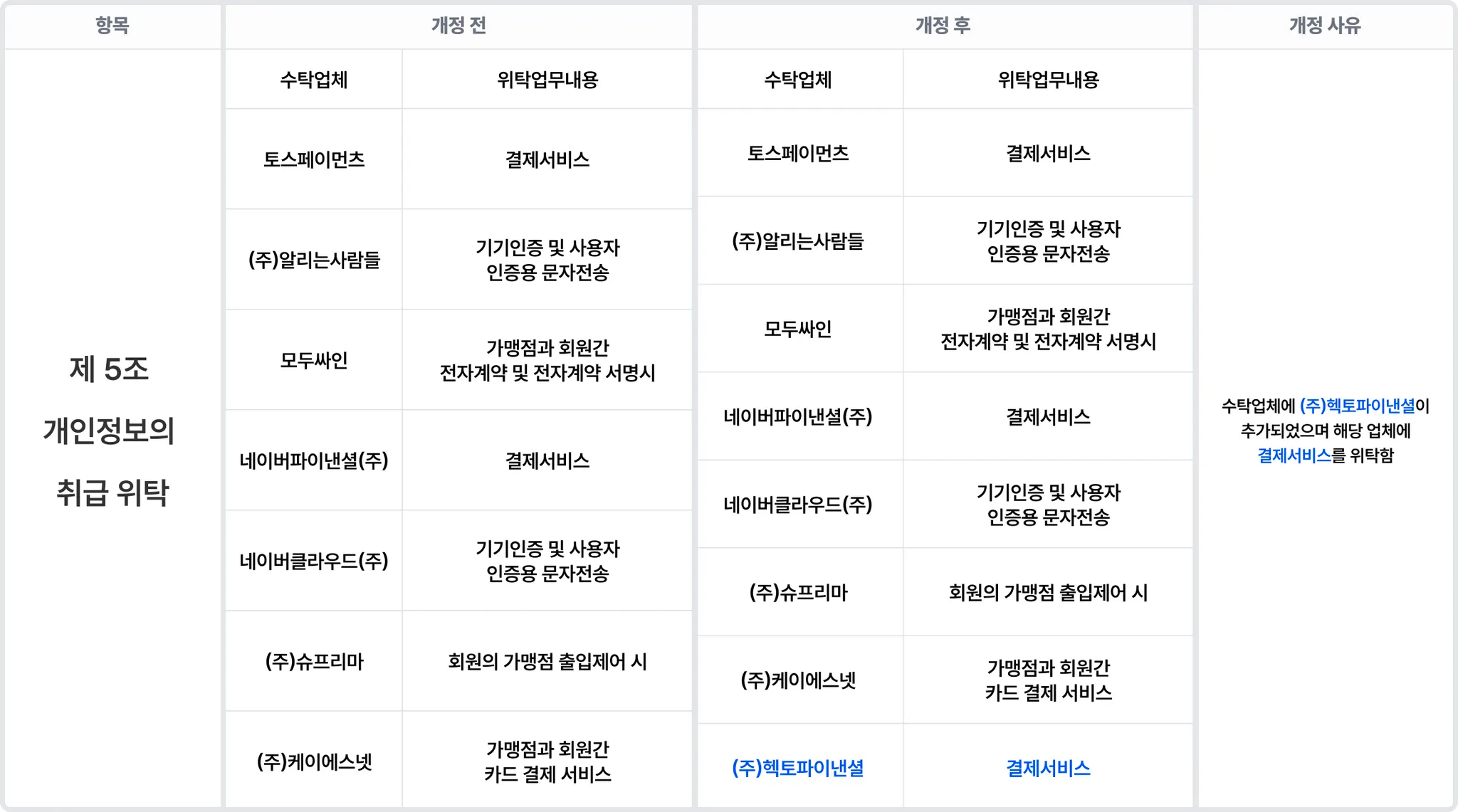 아래와 같이 ‘제5조 개인정보의 취급 위탁’ 중 아래와 같이 개인정보 수탁업체 및 위탁사항을 추가할 예정입니다.