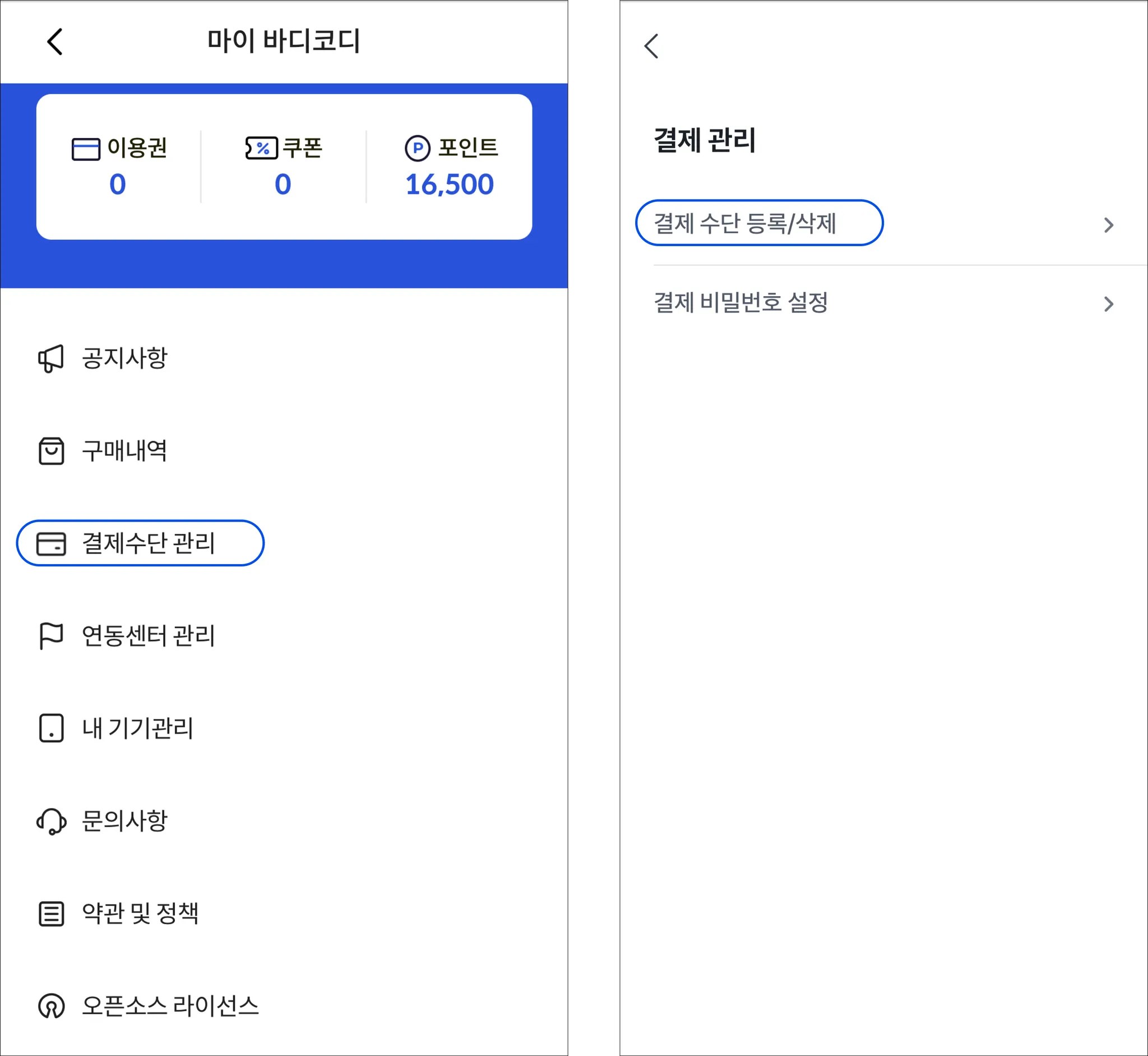 결제 비밀번호 관리, 결제수단 추가나 삭제는 바디코디 멤버스앱 > My > 결제수단관리 에서 할 수 있어요.