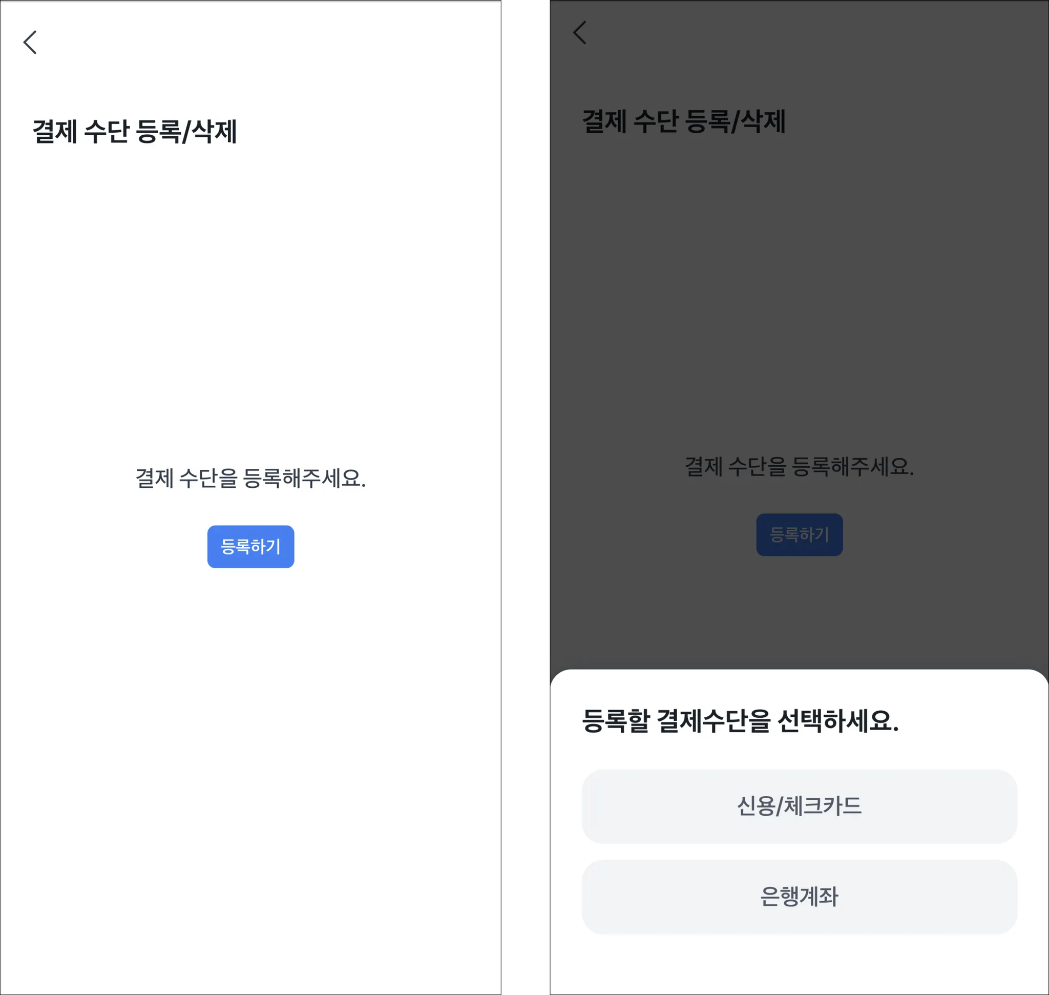 결제수단은 신용/체크카드와 은행계좌를 등록하실 수 있어요.