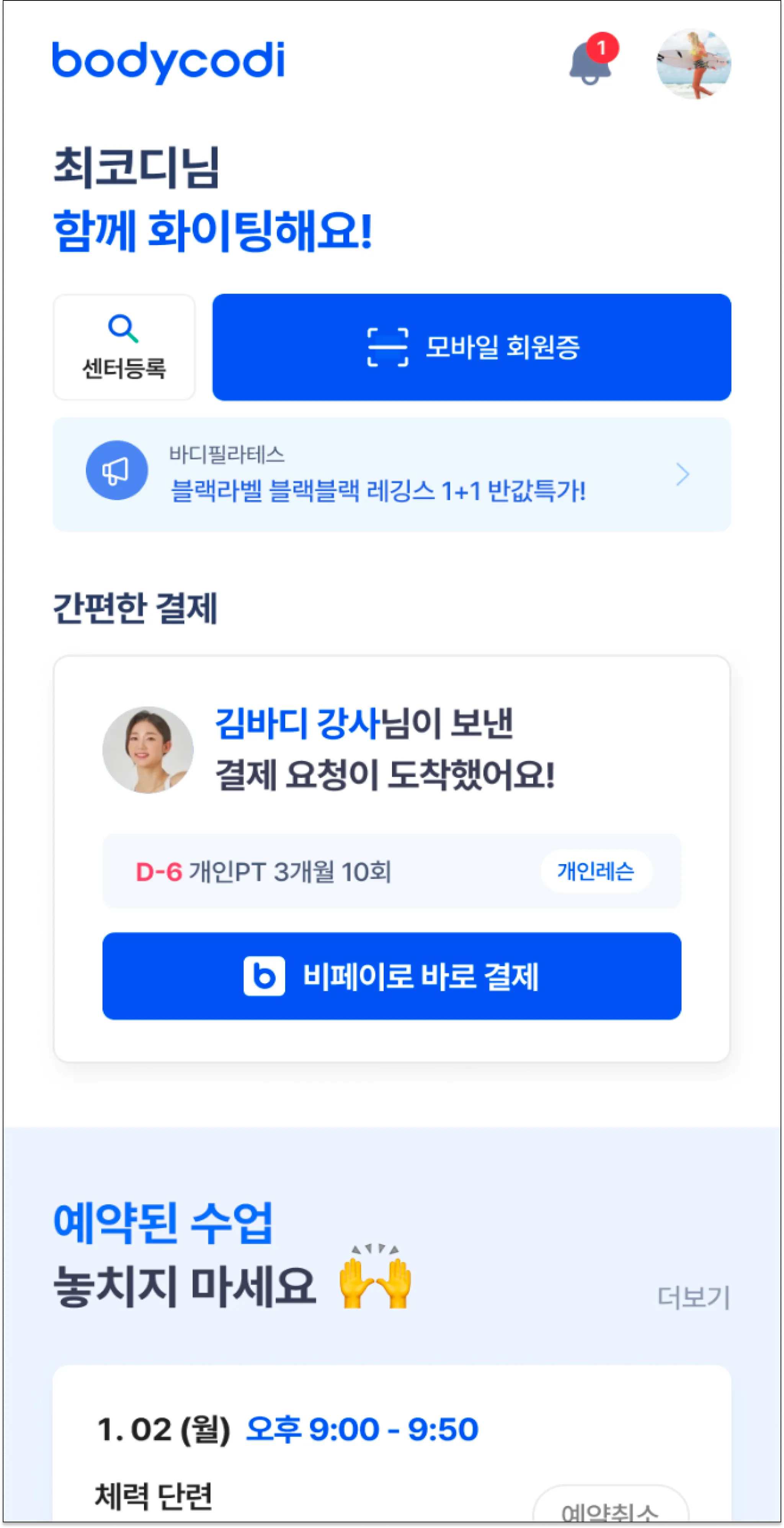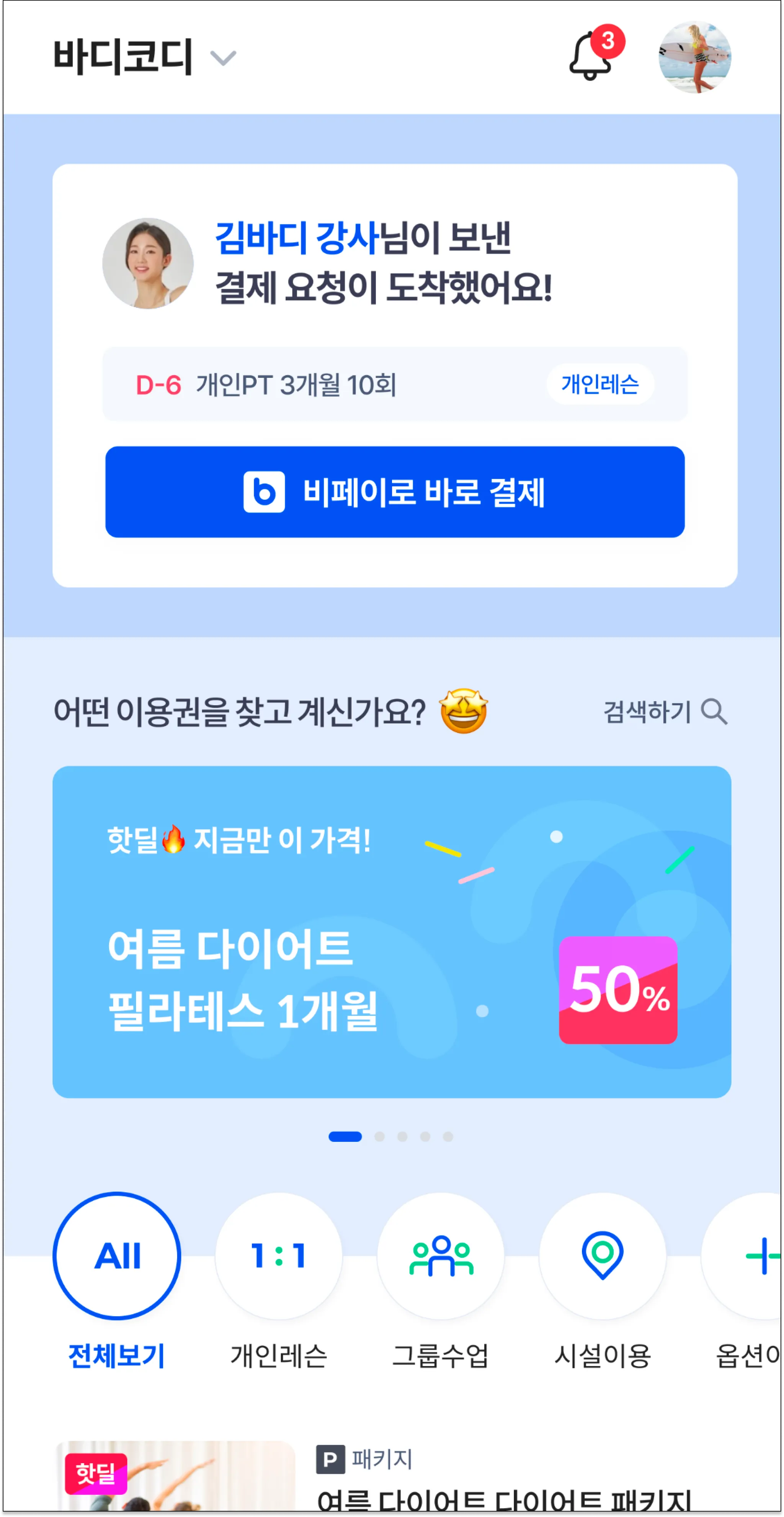 홈 화면에서 김바디 강사님이 보낸 결제 요청을 확인할 수 있어요. 7일 이내까지 결제를 비페이로 바로 결제를 누르면 이용권을 결제할 수 있어요.